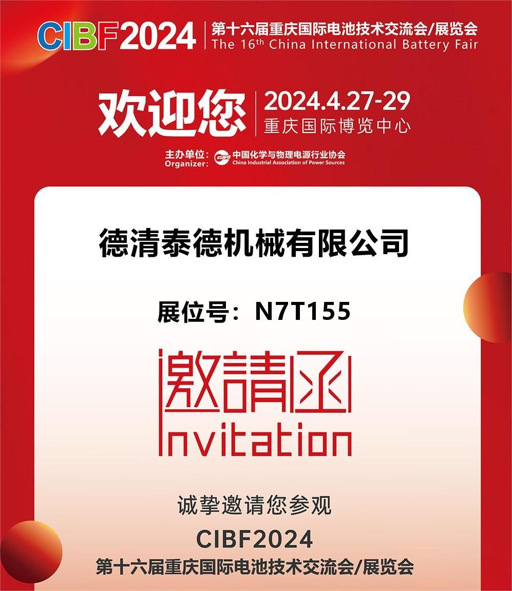 CIBF2024 第十六屆重慶國際電池技術交流會/展覽會 16th China International Battery Fair 時間:2024年4月27-29日 地點:重慶國際博覽中心 德清泰德機械有限公司 期待您的蒞臨指導! 展位號:N7 T155